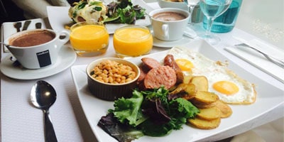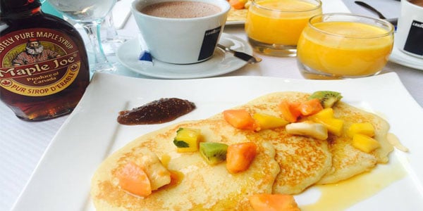 Pour la partie petit-déjeuner, choisissez votre boisson chaude (café, thé, chocolat chaud) et sirotez une orange pressé. Vous serez servi de délicieux pancakes accompagnés de fruits exotiques et de sirop d’érable, pour la gourmandise.